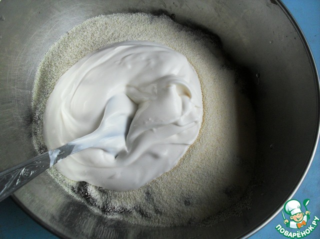 Смешать с манной крупой и сметаной, поставить в холодильник на 1 - 1 1 /2 часа."
