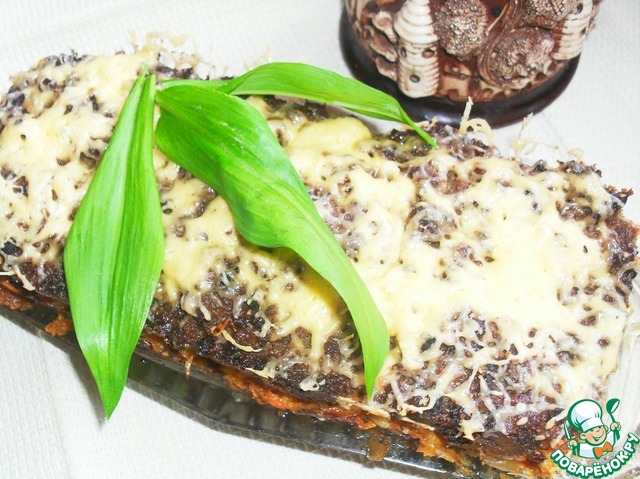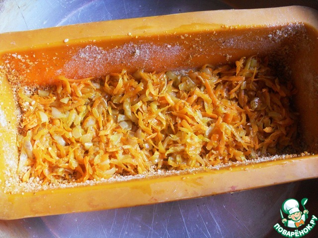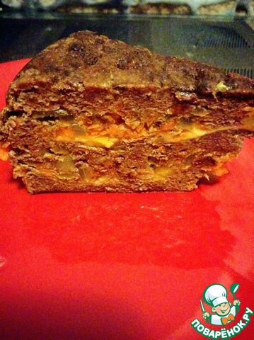 "Слоями выкладывать в форму 1 /2 часть лука, 1 /2 часть моркови (можно слегка посолить),