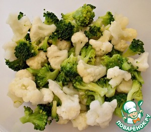 Цветную капусту и брокколи разморозить, а если берете свежую, то варите их до полуготовности в отдельной кастрюле.