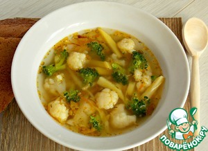 В кипящий суп кладем соцветия цветной капусты и брокколи. Варим еще 4-5 мин. до готовности, добавляем лавровый лист и перец и выключаем. Даем настояться под закрытой крышкой примерно 15-20 мин.