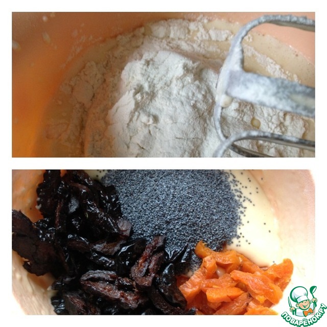 Добавить разрыхлитель и муку. Взбить до однородного состояния. Курагу и чернослив я не замачиваю, они у меня свежие и мягкие как мармелад. Нарезаем их полосками или кубиками и добавляем к тесту. Мак не запариваем и добавляем тоже к тесту. Аккуратно перемешиваем тесто лопаткой.
