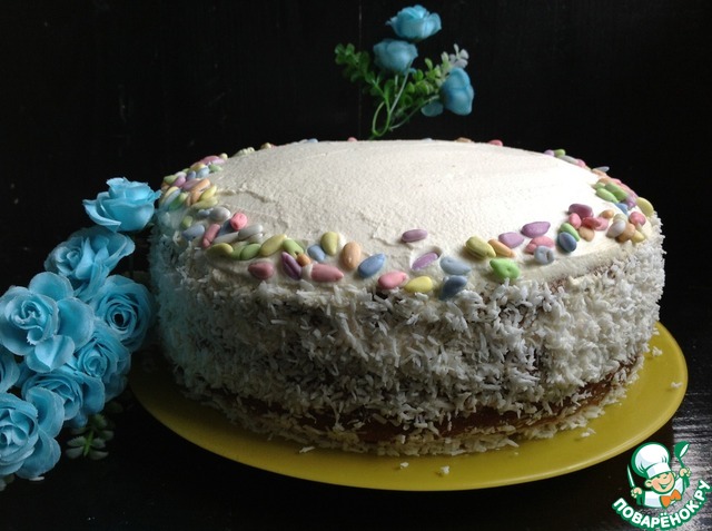 Бисквит разрезать на 3 коржа и промазать кремом коржи, включая бока и верх торта. Бока торта присыпать кокосовой стружкой. Верх украсить на свое усмотрение и желание. Торт убрать в холодильник на пару часов минимум, лучше на ночь.