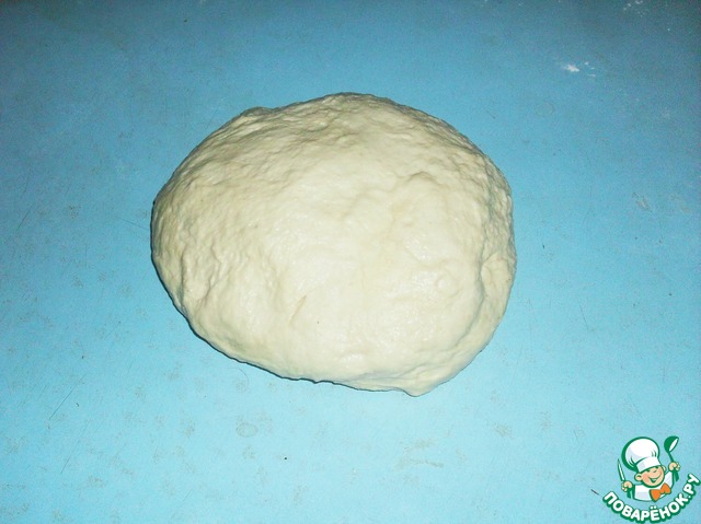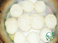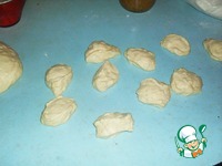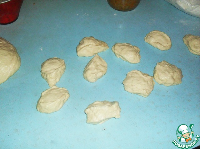 Подошедшее тесто обмять на подпыленном мукой столе или досточке. Раскатать в жгут и разделить на 12 кусочков. |
