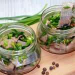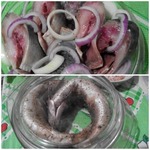 Её можно хранить в холодильнике до 3 суток, но я - большая трусиха, боюсь разных отравлений, поэтому делаю следующим образом: селедку разделываю на филе и, смотря на что мне нужно, либо сразу режу на кусочки, либо оставляю целый пласт филе. Укладываю в баночки, как на снимках,