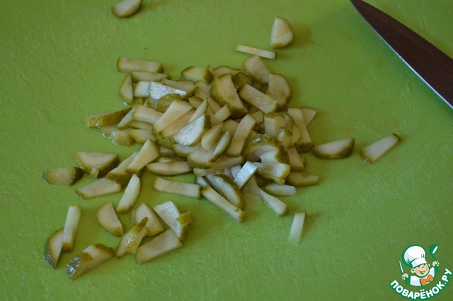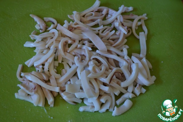 Налить воду в кастрюлю, поставить на огонь, посолить, когда вода закипит, опустить в нее тушку кальмара и отваривать в течение 1 минуты. Остывшие кальмары нарезать соломкой. -