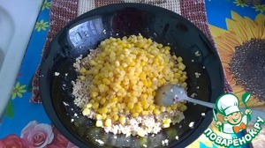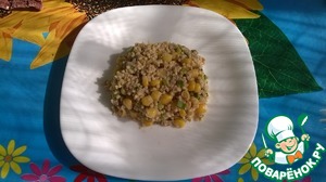 Рыбные консервы разминаем вилкой, добавляем к крупе вместе с маслом. Консервы подойдут любые: одинаково вкусно и с тунцом и с сардинами. Добавляем кукурузу, мелко порезанный огурчик, и зелень. Перемешиваем, заправляем растительным маслом.