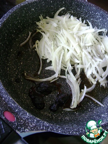 Нарезать лук тонкой соломкой. Выложить в сотейник, добавить сахар – обычный и дарк мусковадо, влить винный уксус и 100 мл воды, потомить все вместе минут 15 - до размягчения лука.