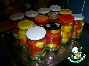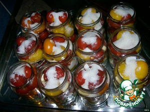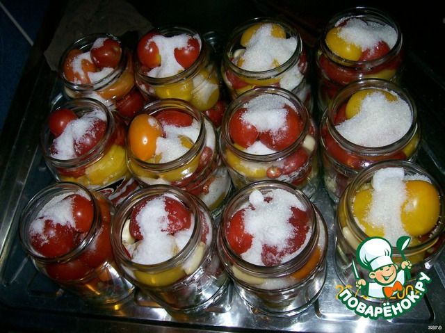 Сладкие, вкусные половинки помидорчиков в необычном маринаде.