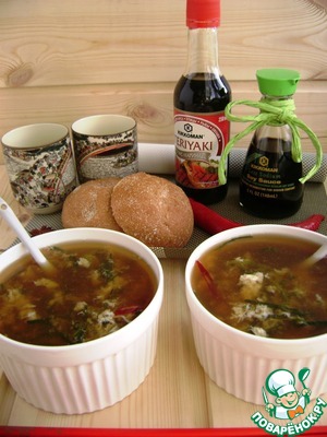 В кипящий бульон положить лук, влить ложку соуса «Терияки» ТМ «Киккоман» -для пущей пикантности. Тонкой струйкой влить взбитые яйца, размешивая их в супе «восьмеркой», чтобы получились красивые кружевные хлопья. Снять с огня, добавить имбирь и перец чили по вкусу, дать настояться под крышкой минут 5.