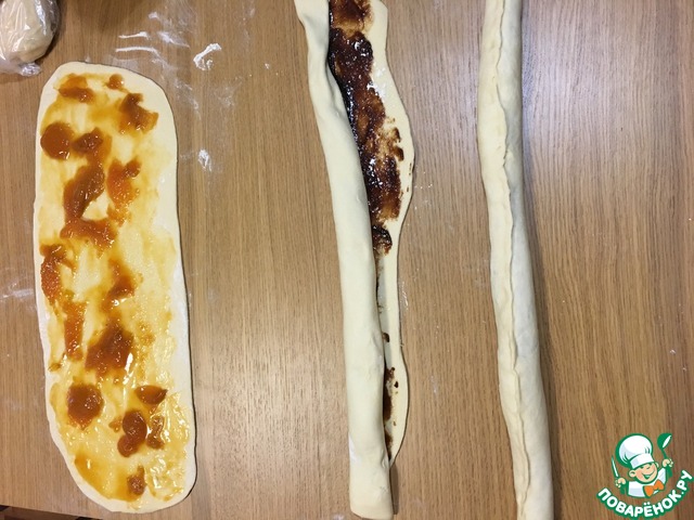 Раскатать тесто длинными широкими полосками, на каждую нанести начинку, аккуратно, оставляя у одного длинного края 0,5 см для защипа