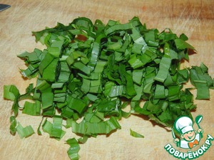 Стебли черемши порезать и отправить в сковороду, потушить 1 минуту.