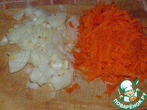 Репчатый лук мелко нарезать, морковь натереть на крупной терке. Отправить овощи в разогретую сковороду, тушить до полуготовности.