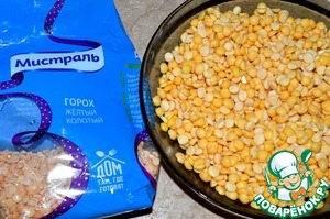 Горох снова промыть, залить двумя стаканами воды и поставить вариться, в конце варки посолить. Готовый горох взбить ложкой или блендером и влить ложку растительного масла.