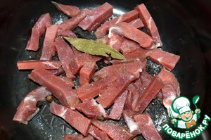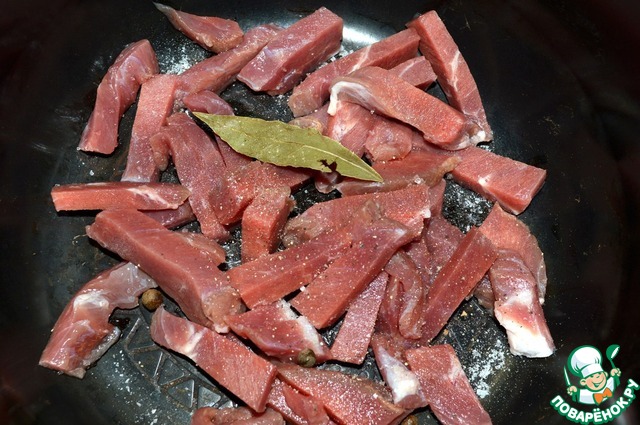 Мясо режем соломкой и складываем в чашу мультиварки, добавляем специи и соль. Ставим программу Тушение на 50 минут. Можно тушить в казане периодически подливая воду или использовать готовую тушенку.