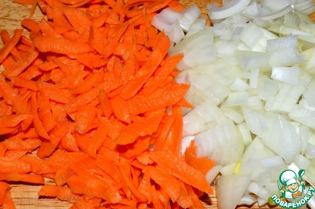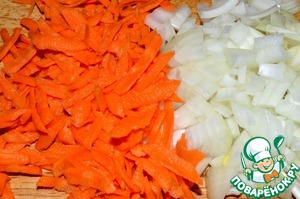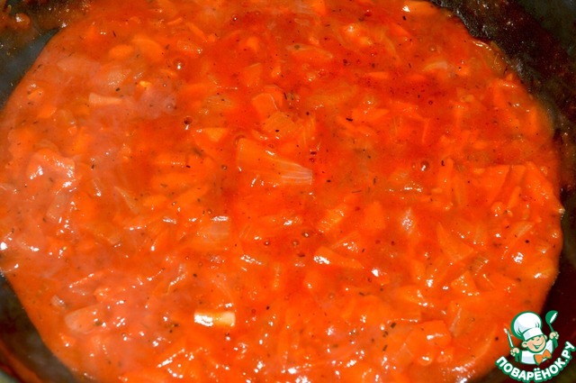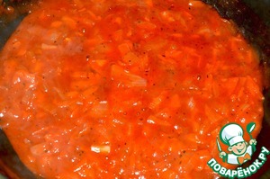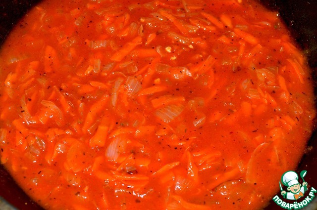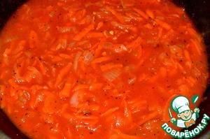 В сковороде разогреть растительное масло и обжарить лук и морковь, добавить томатную пасту и влить около стакана воды. Добавить соль, перец, чабер и уварить.