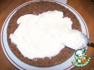 Сливки взбить с сахарной пудрой, добавить растворенный в алкоголе ванилин, еще немножко взбить. Промазать коржи кремом, собрать торт, бока и верх тоже покрыть кремом, верх разровнять.
