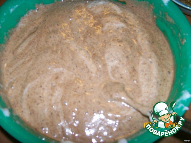 • Тесто вылить в форму и выпекать при температуре 140-150 град. 1 час. Готовность проверить зубочисткой. Дать коржу остыть, вынуть из формы, разрезать на 2 пласта.