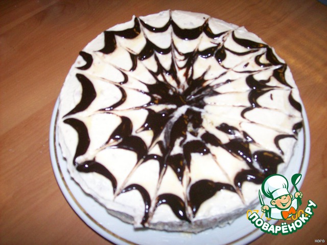 • Шоколад расплавить с добавлением небольшого количества молока (1-2 ст. ложки), в теплом виде налить на торт в виде концентрических окружностей, зубочисткой сделать узор.