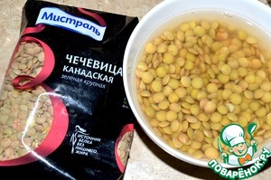 Чечевицу промываем и замачиваем в холодной воде на 12 часов.