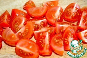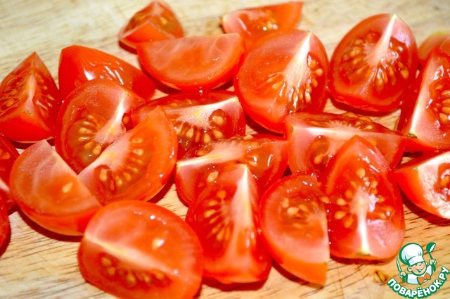 Помидоры режем на четыре части.