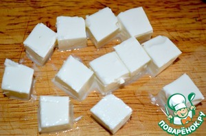 Брынзу режем на небольшие кубики и добавляем в не постный вариант салата.