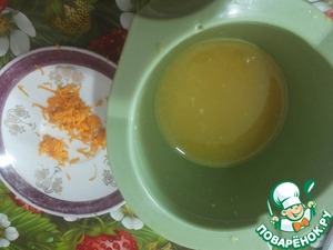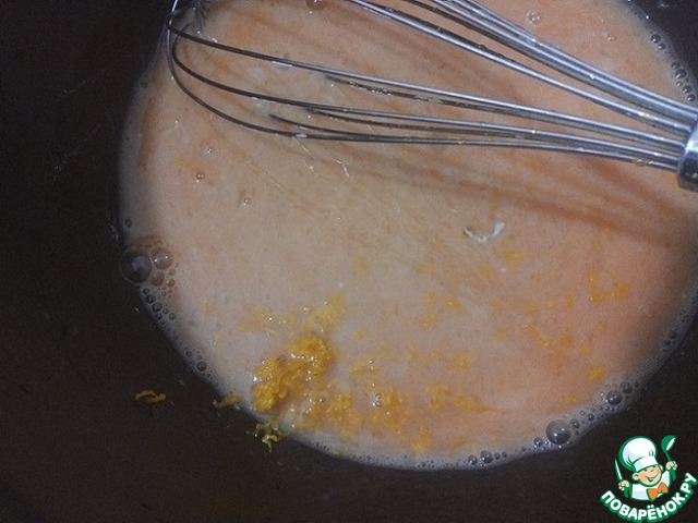 А теперь просто соединить все жидкие составляющие и добавить цедру, желток, соль, растопленное масло и размешать венчиком