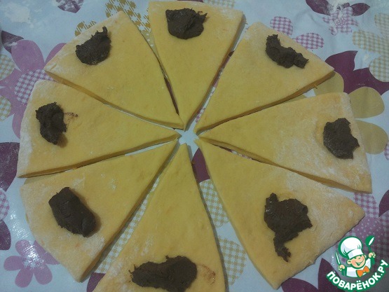 Тесто сразу разделить на 2 части, которые затем поочередно раскатать в круги (у меня они диаметром 26 см), можно и поменьше. Разделить на сегменты. Кстати, необязательно формовать рогалики, можно любые формы раскатать. Разложить начинку. Я обычно кладу шоколадную пасту, джем и т. д. Короче, то, что любят мои внуки!