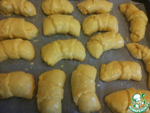 Сформовать рогалики и выложить из на противень, застеленный бумагой. Смазать желтком, смешанным с 2 ст. л. молока.