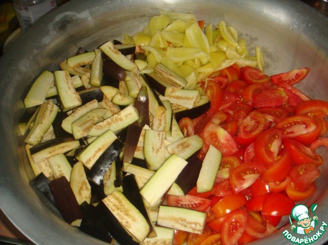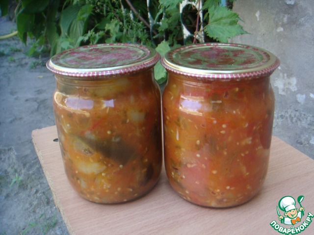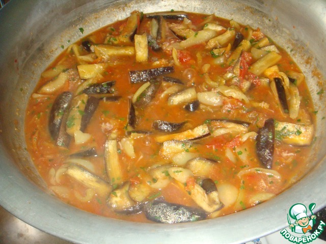 Но некоторые изменения для себя в дальнейшем внесу. Во-первых, на такой объем в самый раз будет 3 головки чеснока, а не 3 дольки. Во-вторых, томаты лучше измельчить блендером, в противном случае кожица начинает жить самостоятельно, что в готовом изделии не очень приятно. Гостям не подашь такое. В третьих, осталаось лишних литра два бульона в кастрюле, поэтому, томаты можно смело уменьшить до 3 кг, а может, и до 2,5 кг. В четвертых, мне не хватило 25 мин. Часть баклажанов даже не успели пропитаться бульоном. 35 минут получилось.