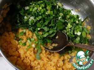 В еще горячую чечевицу добавить порезанные лук и черемшу, перемешать и накрыть крышкой.