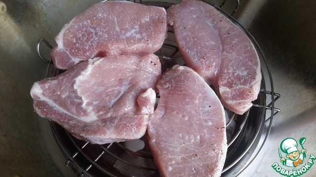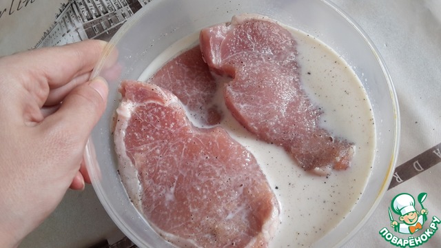 Такой гарнир идеально подходит к свинине. Мне даже навеяло воспоминания о Чехии: там тоже всегда мясо подают с разными видами соленой и маринованной капусты. В качестве скоромного блюда для мужа я приготовила свиные эскалопы в аэрогриле. Сначала замариновала эскалопы на час в молоке со специями - так очень нежным мясо получается. Из специй у меня были черный молотый перец, сушеный чеснок, смесь для свинины (тмин, паприка и кориандр) и йодированная соль.