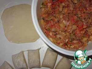 Чтобы не случилось остатков теста или фарша, а слепилось тютелька в тютельку, разделила тесто пополам (для постного и мясного), порезала на "блинчики", раскатала и фарш распределила по всем тестяным кружочкам сразу (в среднем по 1 ст. ложке с горкой). -