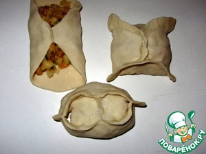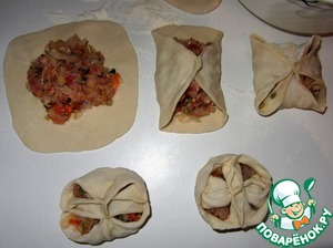 Манты с мясом слепила цветочкками. Надеюсь, что эти фото наглядно показывают последовательность лепки. ("Читаем" шаги по фото слева направо, сверху вниз.)