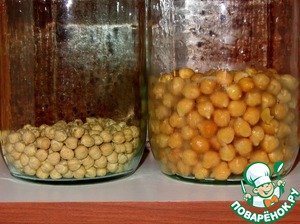 Первым делом варим нут. Вот так он "вырастает" после замачивания на ночь и часовой варки. Банки одинаковые, стакан сухого нута трансформировался в 2,5 стакана варёного. Здесь нам понадобится 1 стакан варёного нута, не варить же треть стакана! ) Обычно из оставшегося готовлю нутовую муку, которая отлично хранится и может понадобиться в самых разных целях в любой момент.