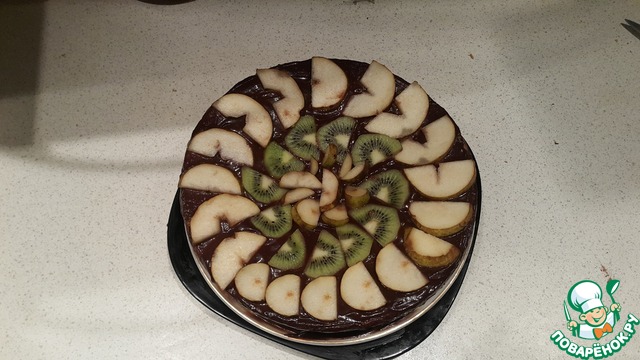 Ну и последнее, готовим глазурь. Смешиваем 2 ложки столовых сметаны, 2 ложки столовых какао, 30 грамм масла сливочного и 3 ст. ложки сахара. Все это варим постоянно помешивая, пока все комочки не растворятся. До кипения лучше не доводить. Ну а теперь выливаем всю глазурь на середину верхнего коржа и размазываем по всему нашему тортику. Смазываем и бока. Сверху я решила украсить немного фруктами, этого можно не делать. Можно посыпать орешками. И вот такой тортик получается. Сразу детство вспоминается =) Надеюсь, что мой первый рецепт вам понравится. Я старалась =) С картинками я так и не разобралась как их переворачивать и как заменить одну картинку на другую, так что извините за перевертыши и повторяющуюся картинку с кремом =)