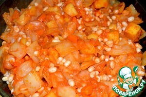 Когда капуста будет готова, добавляем в сковороду фасоль, перемешиваем и готовим 5 минут. Даем постоять под крышкой 1 минут.