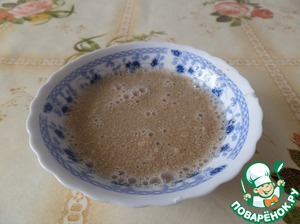 В чашечку высыпаем сахар и сухие дрожжи. Добавляем теплой воды (75мл). Перемешиваем. Оставляем до появления "шапочки".