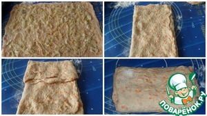 Одну часть теста раскатываем в прямоугольник. На него выкладываем обжаренный лук. Перекидываем края прямоугольника один на другой, т. е получится прямоугольник меньшего размера. Затем еще раз складываем. Придаем форму. Выкладываем на противень. Это постный вариант.
