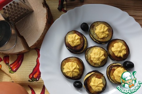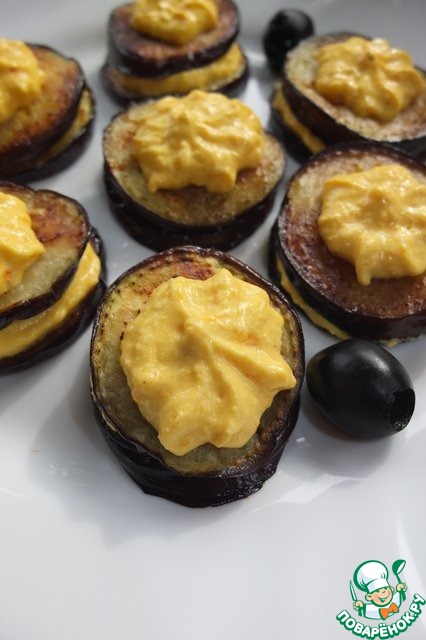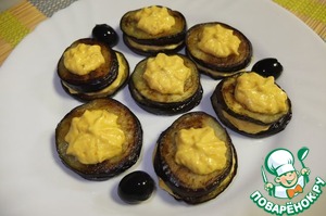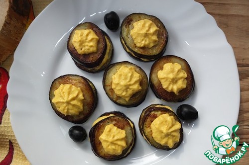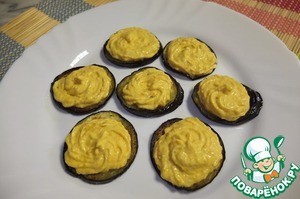 Баклажан выкладываем на тарелку, сверху кремообразную смесь, я воспользовалась кондитерским шприцем.