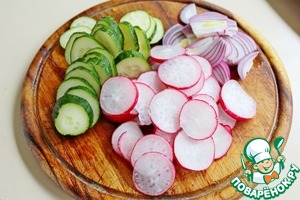 Огурец и редис нарезать тоненькими кружочками, лук -перьями.
