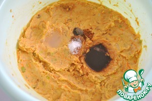 2) В получившуюся массу добавляем соевый соус, перец, сахар, мускатный орех, лимонный сок - перемешиваем.