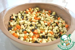 баклажаны с морковью режем кубиками 1 х 1 см. Смешиваем с маслом. Отправляем в разогретую до 180*С духовку. Примерно через 10 мин. духовку открыть и перемешать овощи. -