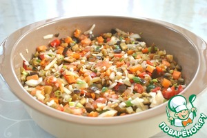 5) Через 20 мин. добавляем репчатый лук, перец сладкий, чеснок, помидоры (снять шкурку) - все мелко порезано. Тщательно перемешиваем. Я не солила, вы можете посолить. И отправляем в духовку еще на 20 мин., через 10 мин. помешать.