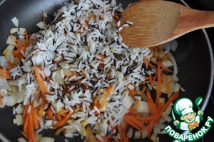 Делим тушёные овощи пополам. К половине тушёных овощей на сковороду кладём половину готового рисового микса. Перемешиваем.