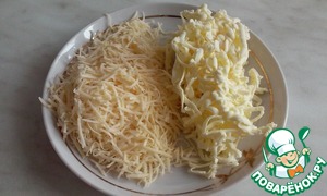 Итак, приступаем. Натираем на крупной терке охлажденное в холодильнике сливочное масло, на мелкой терке-сыр.