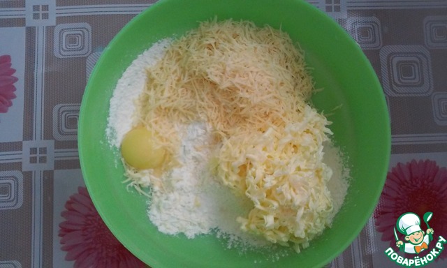 В просеянную муку добавляем натертые сыр и масло, щепотку соли и яичный желток.