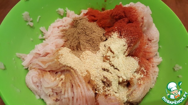 Добавить соус-маринад или соевый соус и специи. Хорошенько вымесить фарш.