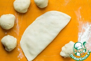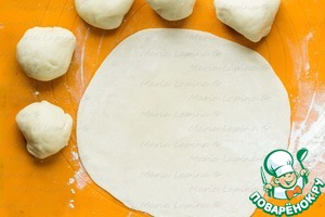 Тесто разделяем на 6 равных частей и раскатываем в тонкие лепешки