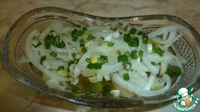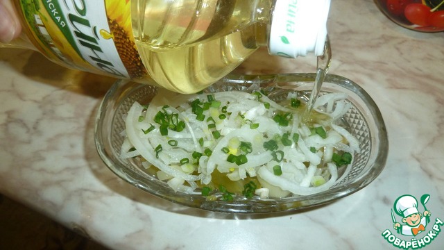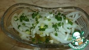Посыпать луком, порезанным полукольцами. Можно добавить зелёный лук.