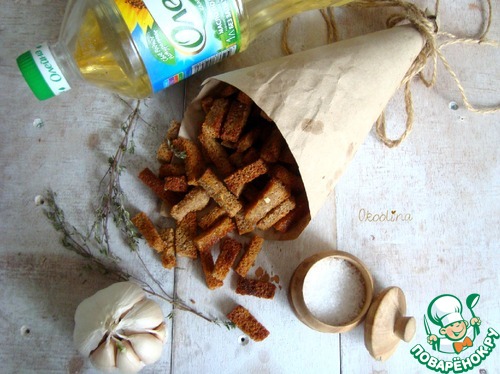 Рецепт проще простого. Просто остался мякиш чёрного хлеба. Делаю квас, корки срезаю, а мякиш остаётся. Вот из него и получаются очень вкусные сухарики солёные, с тимьяном, чесноком и подсолнечным маслом Олейна.